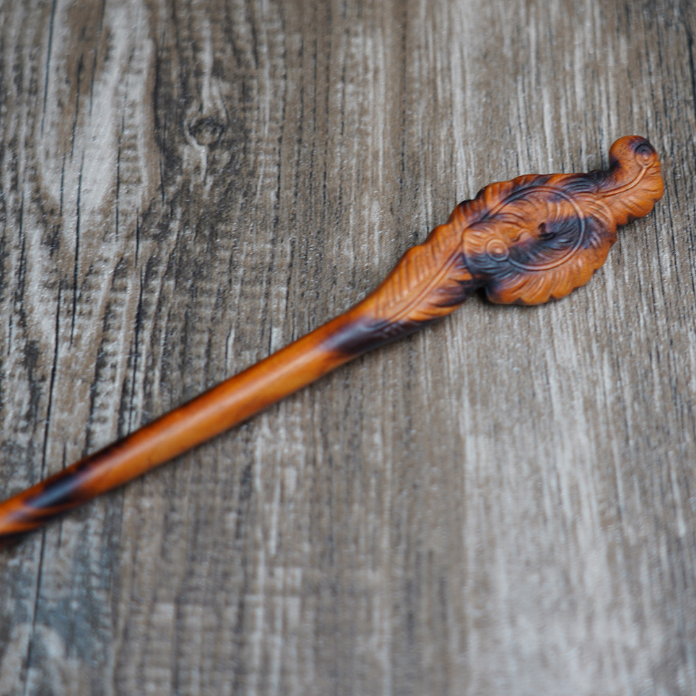 Lightning-struck peach wood hairpin with phoenix tail, exquisitely carved, a Taoist item